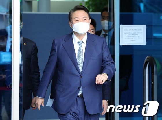 윤석열 대통령 당선인이 6일 오후 신문의날 행사 참석차 서울 종로구 통의동 인수위 집무실을 나서고 있다. 2022.4.6/뉴스1 © News1 인수위사진기자단