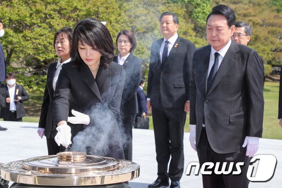 김 여사는 첫 일정으로 서울 동작구 국립현충원을 찾아 순국선열과 호국영령의 넋을 기렸다. 마스크를 벗고 윤 당선인 옆에 나란히 선 김 여사는 손에 흰 장갑을 끼고 현충탑에 분향했다. 퇴장 도중 멈춰 서서 오른손을 왼쪽 가슴에 올리고 국기에 경례하는 모습이 포착되기도 했다.