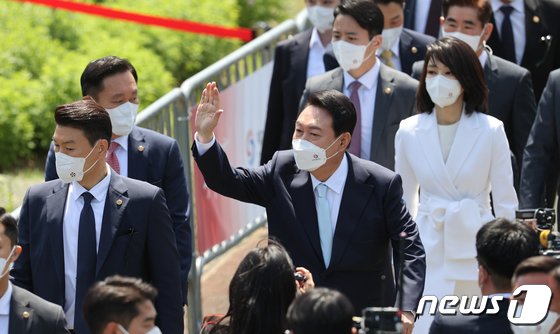 ‘부인’의 면모가 포착되기도 했다. 윤 대통령 내외는 이날 오전 11시50분쯤 취임식이 끝난 뒤 박근혜 전 대통령을 직접 배웅했다. 박 전 대통령이 차량에 오르고 문이 닫히자 김 여사는 안전을 위해 한 발짝 물러섰는데, 윤 대통령이 그대로 서 있자 직접 팔을 뻗어 잡아당겼다.