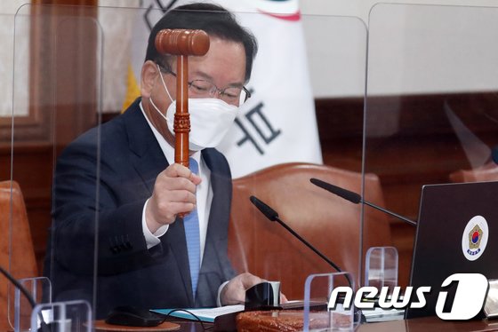 김부겸 국무총리가 6일 서울 종로구 세종대로 정부서울청사에서 열린 임시국무회의에서 의사봉을 두드리고 있다. 이날 회의에서 국무위원들은 2022년도 일반회계 일반예비비 지출안(대통령 집무실 이전경비)를 의결했다. 2022.4.6/뉴스1 © News1 김명섭 기자