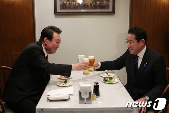 윤석열 대통령과 기시다 후미오 일본 총리가 16일 도쿄 긴자의 한 오므라이스 노포에서 친교를 나누며 맥주로 건배하고 있다. (대통령실 제공) 2023.3.17/뉴스1 © News1 오대일 기자 |