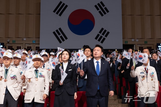 윤석열 대통령과 김건희 여사가 25일 대구 엑스코에서 열린 6·25전쟁 제74주년 행사에서 6·25의 노래를 부르며 태극기를 흔들고 있다. (대통령실 제공) 2024.6.25/뉴스1 © News1 송원영 기자