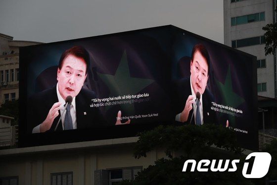 윤석열 대통령이 22일 베트남을 국빈 방문한 가운데 대통령실은 하노이 시내에 '‘교류·협력을 통해 같이 발전하는 동반자’란 주제의 광고 영상을 상영 중이라고 밝혔다. (대통령실 제공)