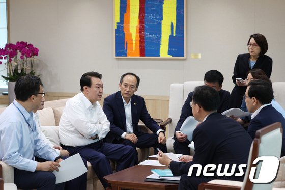 윤석열 대통령이 8일 오전 용산 대통령실에서 제1차 비상경제민생회의를 주재하기 전 추경호 경제부총리 겸 기획재정부 장관, 최상목 경제수석, 이영 중소벤처기업부 장관 등과 사전 환담을 하고 있다. (대통령실 제공) 2022.7.8/뉴스1 © News1 안은나 기자