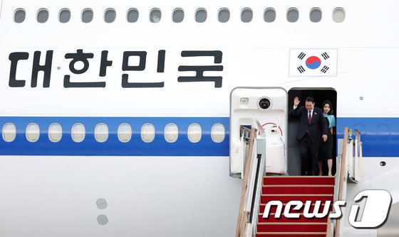 윤석열 대통령과 김건희 여사가 3박5일 동안 스페인 마드리드에서 열린 나토(NATO·북대서양조약기구) 정상회의 첫 순방을 마치고 1일 경기 성남 서울공항에 도착해 손을 들고 있다. (대통령실사진기자단) 2022.7.1/뉴스1 © News1 안은나 기자