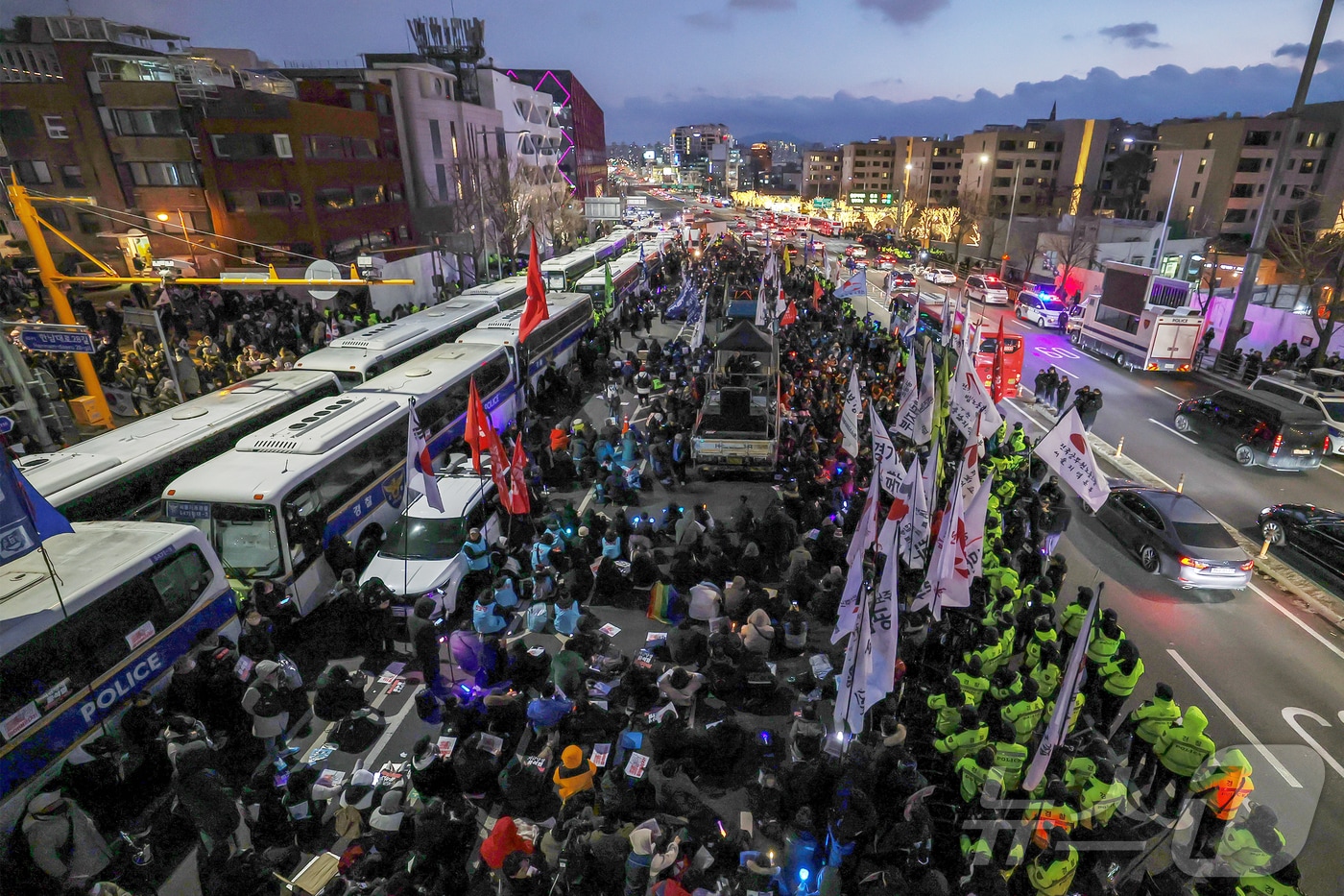 12·3 비상계엄 사태 우두머리로 꼽히는 윤석열 대통령의 첫 번째 체포영장 집행이 무산되면서 대통령 관저가 위치한 서울 용산구 한남동에서는 눈 내리는 늦은 밤까지 진보·보수단체가 약 430m 거리를 두고 맞불 집회를 벌였다.