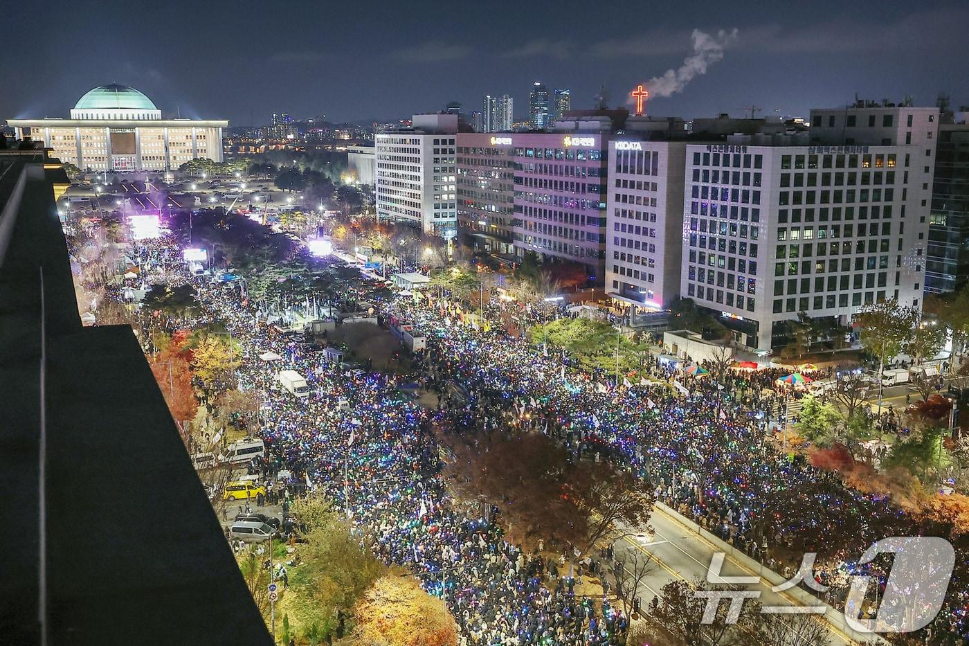 7일 오후 국회의사당 앞에서 열린 ‘범국민촛불대행진’ 집회에서는 수십만 명의 시민들이 국회를 에워싸고 “탄핵”을 외치며 여당 의원들에게 울분을 쏟아냈다. 이날 오후 4시 30분 기준 주최 측 추산 100만 명, 경찰 추산 약 10만 7000여 명이 모인 것으로 집계됐다.