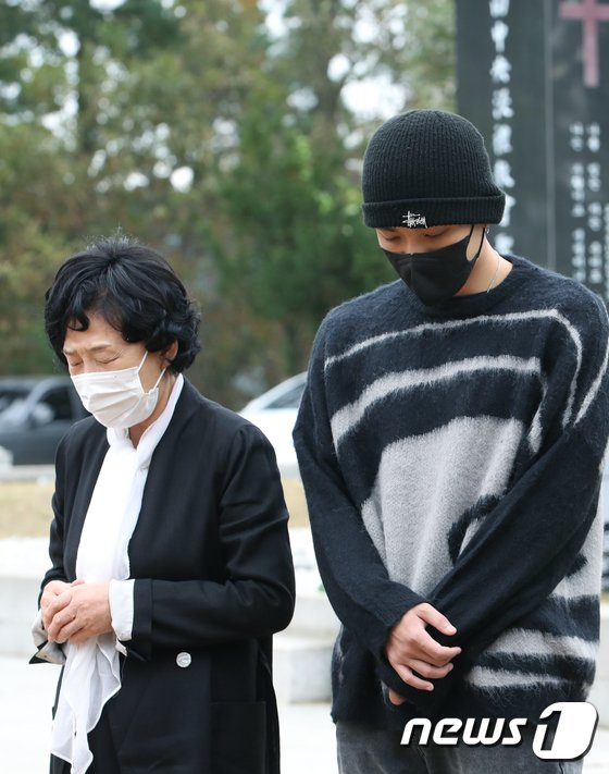 故 최진실의 아들인 가수 최환희(활동명 지플랫)가 고인의 14주기인 2일 오전 경기도 양평군 갑산공원묘역을 할머니와 함께 찾아 기도를 하고 있다. 2022.10.2/뉴스1 © News1 권현진 기자