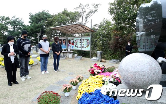 故 최진실의 아들인 가수 최환희(왼쪽 두 번째)가 고인의 14주기인 2일 오전 경기도 양평군 갑산공원묘원을 찾아 어머니를 위한 기도를 하고 있다. 2022.10.2/뉴스1 © News1 권현진 기자