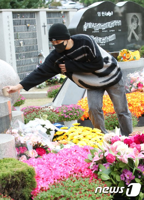 故 최진실의 아들인 가수 최환희(활동명 지플랫)가 고인의 14주기인 2일 오전 경기도 양평군 갑산공원묘역을 찾아 엄마가 좋아했던 커피를 올리고 있다. 2022.10.2/뉴스1 © News1 권현진 기자