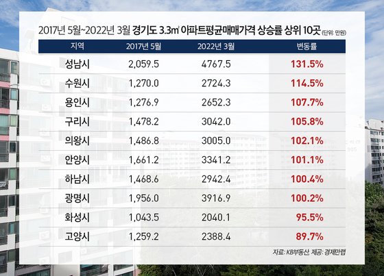 31일 부동산 정보제공 업체 경제만랩이 KB부동산의 주택가격동향을 살펴본 결과에 따르면 성남시의 3.3㎡당 아파트 평균 매매가격은 2017년 5월 2059만원에서 2022년 3월 4767만원으로 131.5% 상승했다.