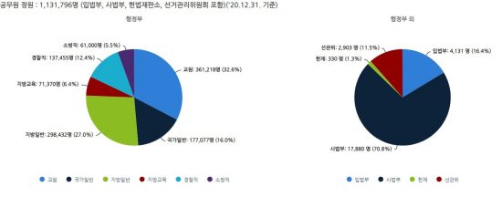 교원과 소방·경찰을 포함한 행정부 공무원은 110만6552명, 입법·사법부, 선거관리위원회 등 행정부 외 공무원은 2만5244명이다.