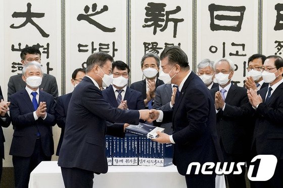 문 대통령은 “오늘 그런 자료들을 모아서, 방대한 우리 국정자료와 통계자료들을 다 포함한 국정백서를 남기게 됐기 때문에, 아마 이 자료들은 앞으로 이어지는 다른 정부들과 비교를 하게 될 것”이라며 “특히 다음 정부의 경우에는 우리 정부의 성과를 전면적으로 거의 부정하다시피 하는 가운데 출범을 하게 됐기 때문에 더더욱 우리 정부의 성과, 실적, 지표와 비교를 받게 될 것이라고 생각한다”고 말했다.