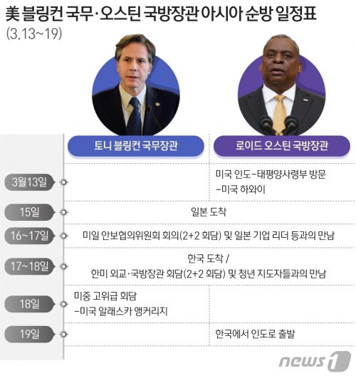 외교부에 따르면 블링컨·오스틴 두 장관은 이날 오후 한국에 도착할 예정이다. 이들은 첫날부터 각각 한미 국방장관회담과 외교장관회담 일정을 소화한다.