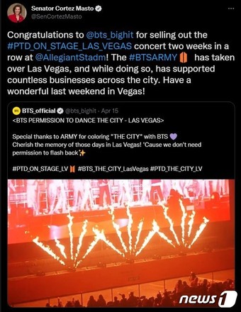 미 민주당 소속 캐서린 코테즈 매스토 네바다주 상원의원은 지난 17일(현지시간) 자신의 트위터에 BTS의 공식 소셜 미디어 계정을 리트윗하며 BTS가 라스베이거스에서 2주 연속 콘서트를 매진시킨 것에 대해 축하의 뜻을 전했다.