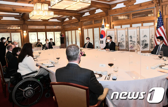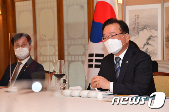 | 김부겸 국무총리가 5일 서울 종로구 총리공관에서 미 상원의원 대표단과 만찬을 하고 있다. (총리실 제공) 2021.6.5/뉴스1 |