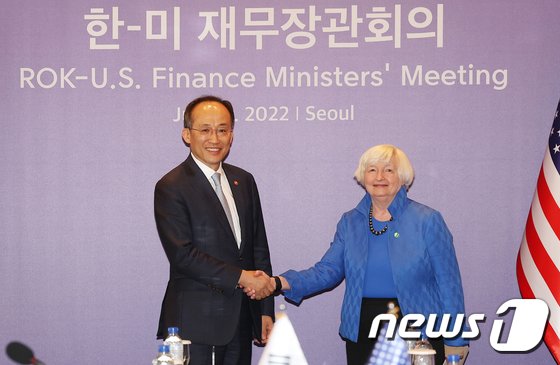 추경호 경제부총리 겸 기획재정부 장관과 재닛 옐런 미국 재무장관이 19일 오후 서울 중구 롯데호텔에서 열린 ‘한미 재무 장관 회의’ 에서 악수를 하고 있다. 이날 양국 장관은 세계-한국경제 동향 및 전망, 우크라이나 전쟁 대응, 외환시장 동향 및 협력, 기후재원, 글로벌보건 등을 주요 의제로 논의한다. (공동취재) 2022.7.19/뉴스1 © News1 송원영 기자