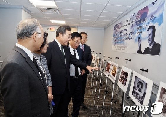 이낙연 전 국무총리(왼쪽부터 세번째)와 최성 한반도평화경제연구원 이사장(네번째) 등이 18일(현지시간) 워싱턴DC 인근 버지니아에서 열린 고(故) 김대중 전 대통령 서거 13주기 추도식에 참석해 한켠에 놓인 김 전 대통령의 사진들을 보고 있다. © News1(워싱턴특파원단 제공)