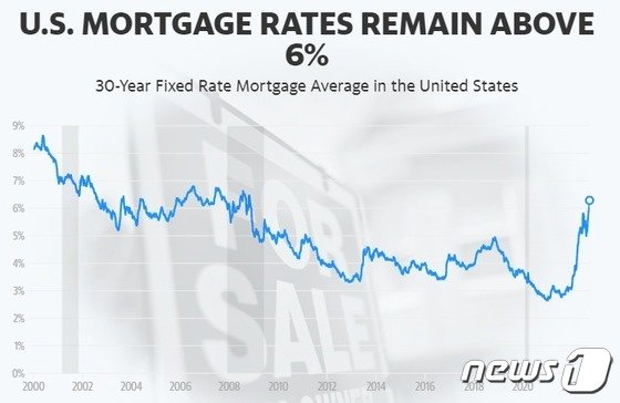 22일(현지시간) 미국의 대표적 모기지 업체인 프레디맥에 따르면 30년물 모기지 이자가 6.3%까지 치솟았다.
