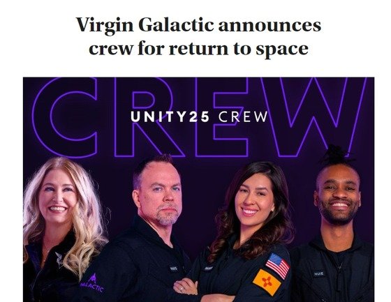 AFP 통신·CNN 방송에 따르면 8일(현지시간) 버진갤럭틱은 성명을 내고 이달 말 자사 우주선 ‘VSS유니티’에 2명의 조종사와 4명의 승무원이 탑승한다고 밝혔다. 승무원은 모두 버진갤럭틱 소속 직원으로 승객들을 대신해 객실 내부를 경험할 예정이다.
