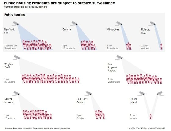노스다코타주 롤레트의 한 공공주택에는 세입자가 100명 정도인데 CCTV는 이보다 많은 107대가 깔려있어, 뉴욕 라이커스섬 교도소에 설치된 것과 비슷한 수준이라고 WP는 지적했다.