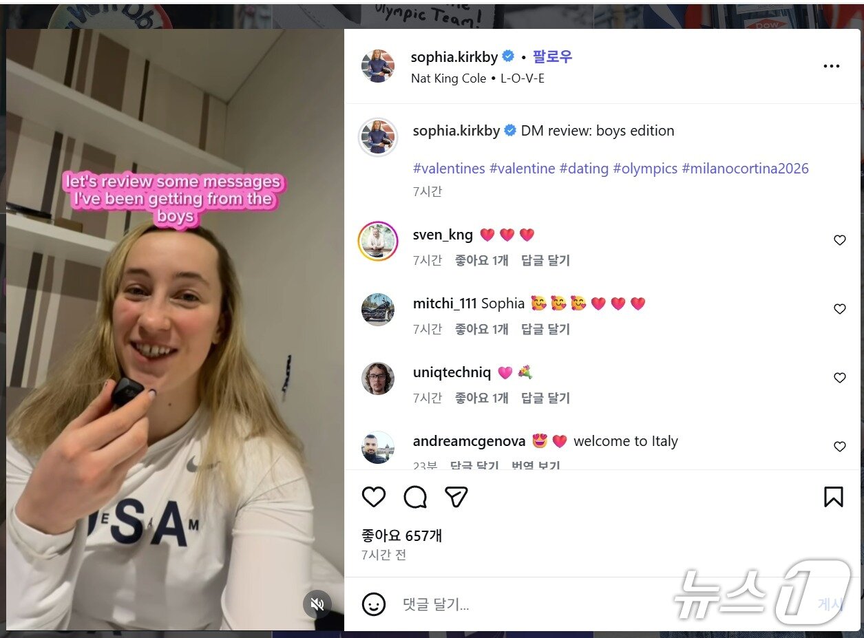 뉴스1 보도에 따르면, 2026 밀라노·코르티나담페초 동계 올림픽에 출전 중인 미국 여자 루지 국가대표 **소피아 커크비**가 현지에서 공개적으로 데이트 상대를 모집했다가 수백 건의 메시지를 받으며 화제를 모으고 있다.
