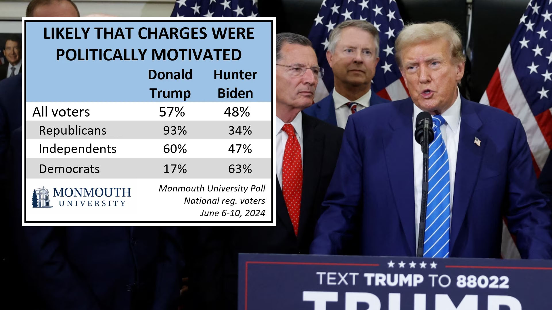 아울러 유권자들의 48%는 조 바이든 미국 대통령의 차남 헌터 바이든의 총기 불법 소유 혐의에 대해서도 정치적 동기가 있다고 응답했다. 민주당 지지자의 경우 63%가, 공화당 지지자는 34%가 그렇다고 답했다.