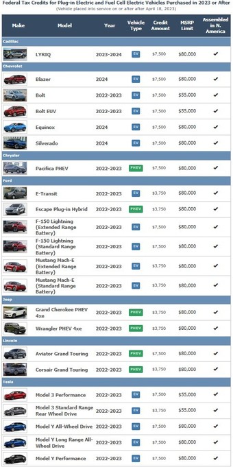 플러그인 하이브리드차 중에선 크라이슬러의 퍼시피카(Pacifica)와 링컨의 에비에이터 그랜드 투어링이 7500달러의 세액공제를 받을 수 있고, 포드 이스케이프, 지프의 그랜드 체로키 및 랭글러, 링컨코세어 그랜드 투어링 등은 3750달러의 보조금을 받는다.