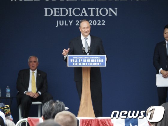 미 정부측 대표 축사는 세컨드 젠틀맨이 나섰다. 엠호프는 “바이든 대통령을 대신해 이곳에 오게 돼 매우 영광”이라며 “바이든-해리스 행정부는 참전용사들과 한미 동맹의 힘을 기리고자 한다”고 말했다.