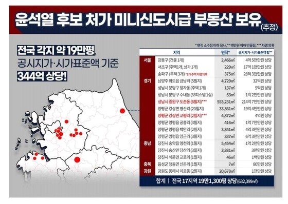 또 “윤 후보의 처가가 본인 명의 또는 그들의 가족회사인 ESI&D와 김 씨가 대표이사로 재직하는 ㈜코바나 명의로 보유 중인 부동산은 총 48개로, 총면적은 7만41332만㎡(2만2425평) 상당이고 공시지가 및 시가표준액 총액이 116억원 수준”이라고 지적했다.