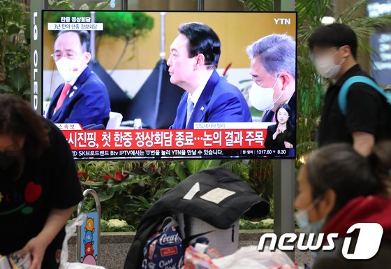 15일 오후 인천국제공항 제1여객터미널 입국장 TV에서 윤석열 대통령과 시진핑 중국 국가주석의 첫 정상회담이 방송되고 있다. 2022.11.15/뉴스1 © News1 김진환 기자