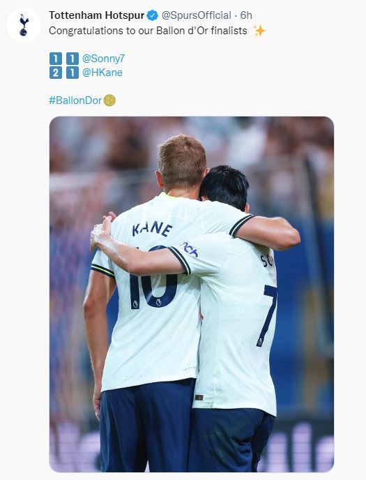 토트넘 구단도 소셜네트워크서비스(SNS)를 통해 손흥민과 케인이 포옹하고 있는 사진을 게재하며 “발롱도르 최종 후보에 오른 것을 축하한다”고 메시지를 남겼다.