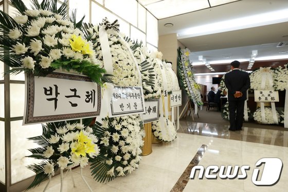 서울 서대문구 신촌세브란스 병원 장례식장 지하 2층 특실 1호실에 자리 잡은 전씨의 빈소에는 오후 8시32분쯤 입원 중인 박근혜 전 대통령 명의의 근조 화환이 도착했다.