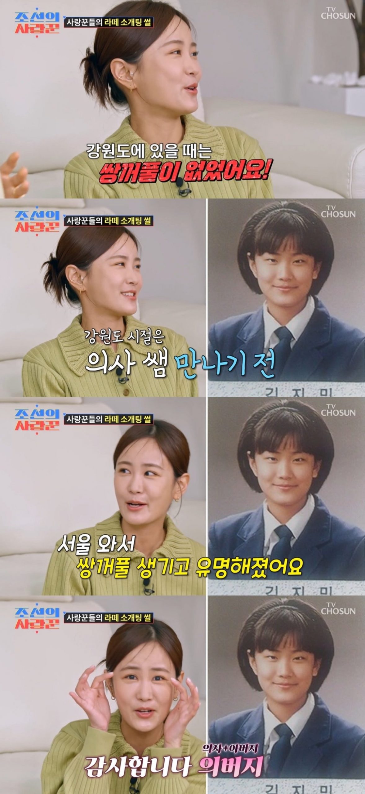 김지민의 고백과 함께 쌍꺼풀 수술 전 모습이 담긴 학창 시절 사진도 공개돼 웃음을 안겼다. 이후 김지민은 “서울 와서 쌍꺼풀 생기고 유명해졌다”며 “감사합니다 의버지(의사+아버지)”라고 쿨하게 말해 주위를 폭소케 했다.