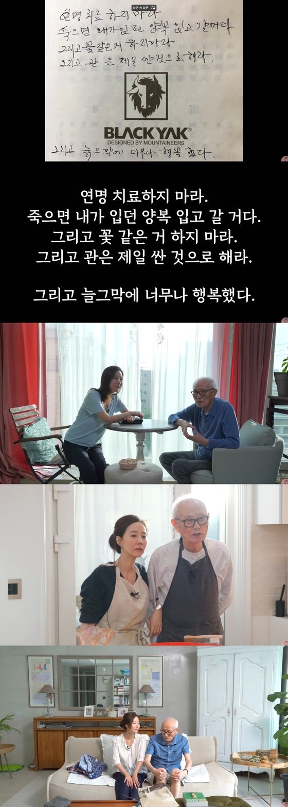 강수지의 아버지는 메모를 통해 “연명치료하지 마라, 죽으면 내가 입던 양복 입고 갈 거다, 꽃 같은 거 하지마라 관은 제일 싼 것으로 해라, 그리고 늘그막에 너무나 행복했다”란 유언을 남겼다.