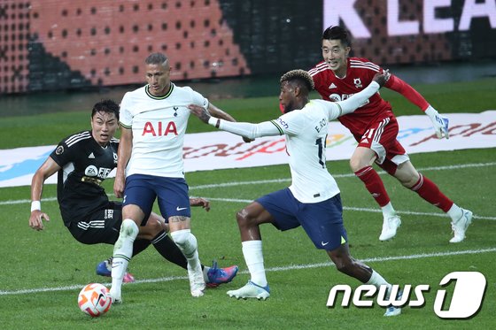 토트넘 홋스퍼의 히샬리송이 13일 오후 서울 마포구 상암동 서울월드컵경기장에서 열린 쿠팡플레이 시리즈 팀 K리그와의 경기에서 골키퍼를 제치고 에메르송 로얄에게 패스하고 있다. 2022.7.13/뉴스1 © News1 이광호 기자