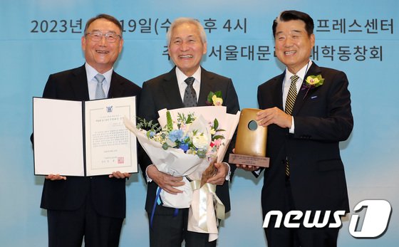 19일 서울 중구 프레스센터에서 열린 제4회 4.19 민주평화상 시상식에서 수상자로 선정된 배우 안성기가 기념촬영을 하고 있다. 왼쪽부터 김인규 서울대 문리대 동창회장, 안 배우, 김종섭 총동창회장. 2023.4.19/뉴스1