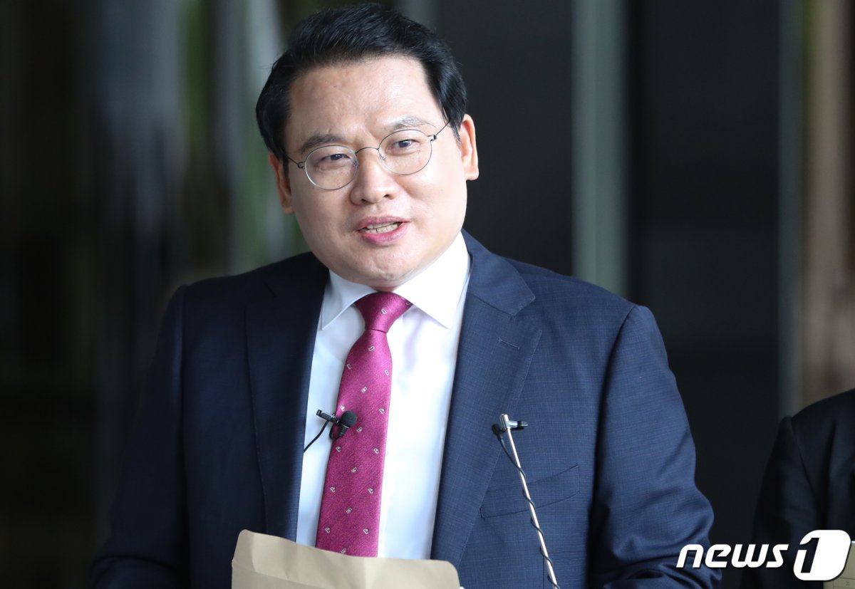 이준석 국민의힘 전 대표에게 성 상납 등 접대를 한 의혹과 관련 참고인 신분으로 검찰 조사를 받는 김성진 아이카이스트 대표의 법률대리인인 강신업 변호사가 20일 오후 서초구 서울중앙지검 앞에서 기자회견을 하고 있다. 2023.6.20/뉴스1 © News1 허경 기자