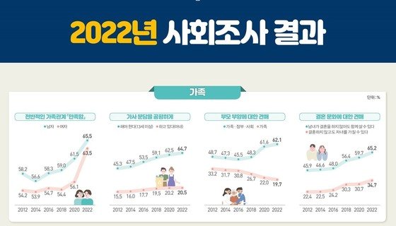 16일 통계청이 발표한 ‘2022년 사회조사 결과’에 따르면 남녀가 결혼을 하지 않더라도 함께 살 수 있다고 생각하는 사람은 65.2%로 2년 전보다 5.5%포인트(p) 증가했다.