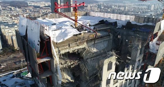 현대산업개발 아파트 신축 공사 붕괴 사고가 발생한 광주 화정동 화정아이파크 상공 촬영. 39층 높이의 아파트 3분의 1 가량의 바닥과 구조물, 외벽이 처참하게 무너져 있다.(광주시 제공 영상 캡처)2022.1.13/뉴스1 © News1 박준배 기자
