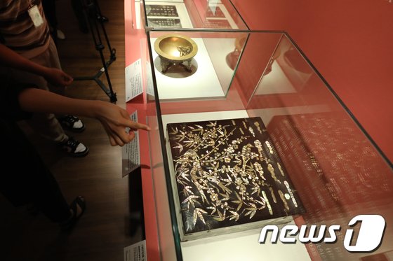 6일 오전 서울 종로구 국립고궁박물관에서 열린 ‘나라 밖 문화재의 여정’ 특별전 언론 공개회에서 관계자들이 ‘나전 매화, 새, 대나무 상자’ 등 전시품을 살펴보고 있다. 2022.7.6/뉴스1 © News1 황기선 기자