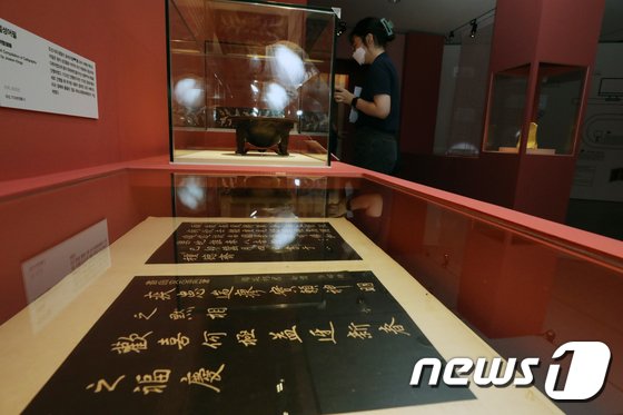 6일 오전 서울 종로구 국립고궁박물관에서 열린 '나라 밖 문화재의 여정' 특별전 언론 공개회에서 관계자들이 '열성어필' 등 전시품을 살펴보고 있다. 오는 7일부터 9월25일까지 진행되는 이번 전시회에서는 외국으로 반출됐다 돌아온 문화재 40여점을 볼 수 있다. 2022.7.6/뉴스1 © News1 황기선 기자