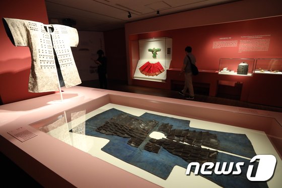 6일 오전 서울 종로구 국립고궁박물관에서 열린 ‘나라 밖 문화재의 여정’ 특별전 언론 공개회에서 관계자들이 ‘면피갑’ 등 전시품을 살펴보고 있다. 2022.7.6/뉴스1 © News1 황기선 기자