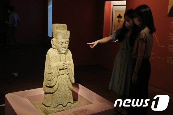 6일 오전 서울 종로구 국립고궁박물관에서 열린 ‘나라 밖 문화재의 여정’ 특별전 언론 공개회에서 관계자들이 ‘문인석’ 등 전시품을 살펴보고 있다. 2022.7.6/뉴스1 © News1 황기선 기자