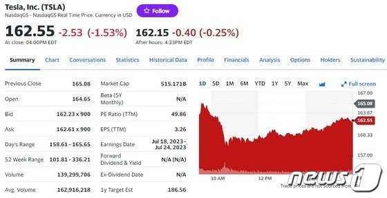 24일(현지시간) 뉴욕증시에서 테슬라는 전거래일보다 1.53% 하락한 162.55 달러를 기록했다.