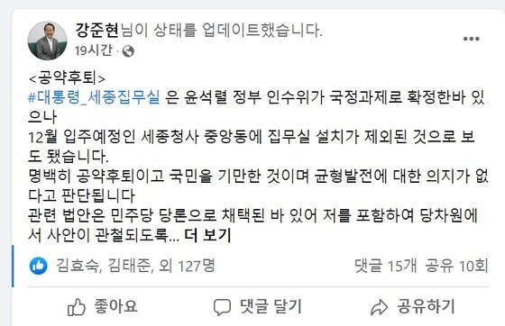 민주당 강준현 의원(세종을)은 13일 페이스북에 “세종 집무실은 윤석열 정부 인수위가 국정과제로 확정한 바 있다”며 “(이는)명백히 공약 후퇴이고, 국민을 기만한 것”이라고 비판했다