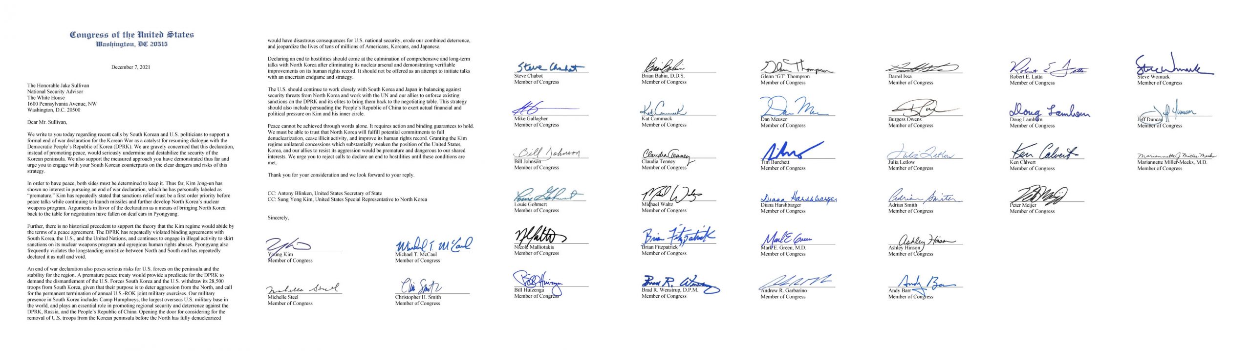 김 의원은 마이클 맥컬(Michael McCaul,공화·텍사스) 외교위원회 공화당 간사와 33명의 동료의원들이 함께 한반도의 안보에 악영향을 미칠 종전 선언을 강력히 반대하는 편지를 제이크 설리번(Jake Sullivan) 국가안보보좌관, 앤서니 블링컨(Antony Blinken) 국무장관, 성 김(Sung Yong Kim) 대북특사에게 보냈다.