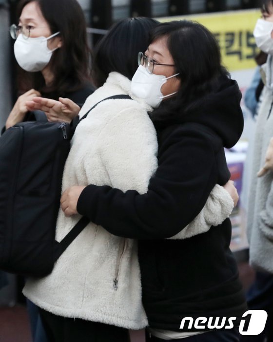 시험 종료 40분 전부터 학교 정문에서 대기하던 한 50대 여성은 수능을 마치고 아들이 나오자마자 부둥켜 안았다.