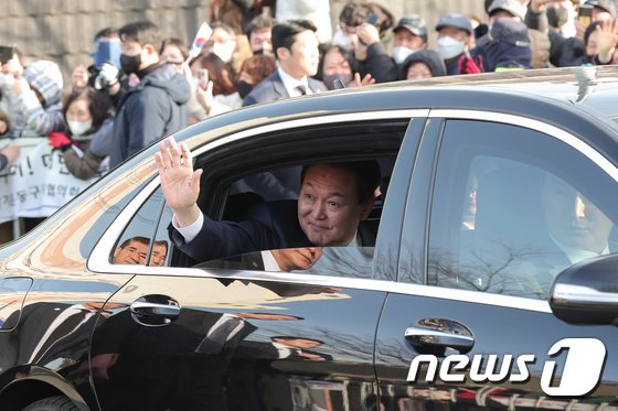 윤석열 대통령이 지난 1일 취임 후 처음으로 경북 구미 고(故) 박정희 전 대통령 생가를 찾아 시민들에게 인사하고 있다. (대통령실 제공) 2023.2.1/뉴스1 © News1 오대일 기자