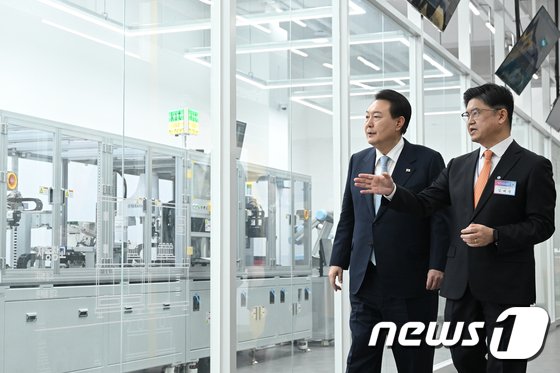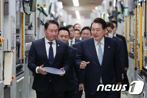 윤석열 대통령이 지난 1일 경상북도 구미시 SK 실트론을 방문, 최태원 SK그룹 회장의 안내를 받으며 실리콘 웨이퍼 라인을 시찰하고 있다. (대통령실 제공) 2023.2.1/뉴스1 © News1 오대일 기자